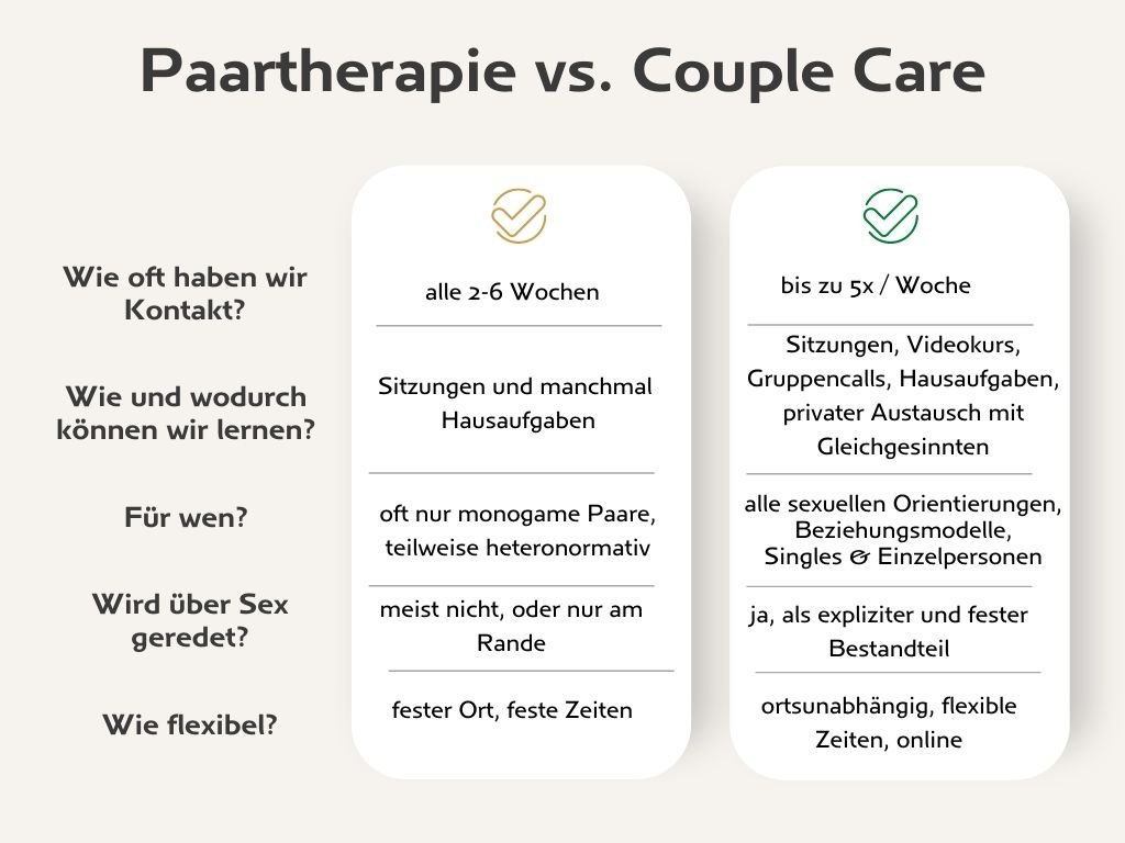 Mit der Couple Care Methode und dem dazugehörigen Couple Care Programm schaffen wir ein Umfeld, das konkrete Hilfestellung für dich in deinen Alltag bringt - und damit völlig anders wirkt als klassische Paartherapie.